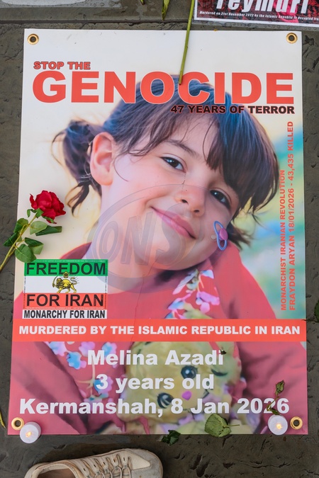 Trafalgar Square, London, UK. 7th February 2026.A 'Stop The Genocide' Exhibition to honour and remember those killed by the government of the Islamic Republic of Iran over the 47 years since the Islamic Revolution in 1979.Hundreds of photographs and personal objects were surrounded by candles and flowers.Many images included some of the estimated 90,000 killed during the current genocide by the regime; 12,000 - 36,500 of those are thought to have been killed over the Jan 8th-9th crackdown on the current protests., Credit:Photo by Amanda Rose / Avalon