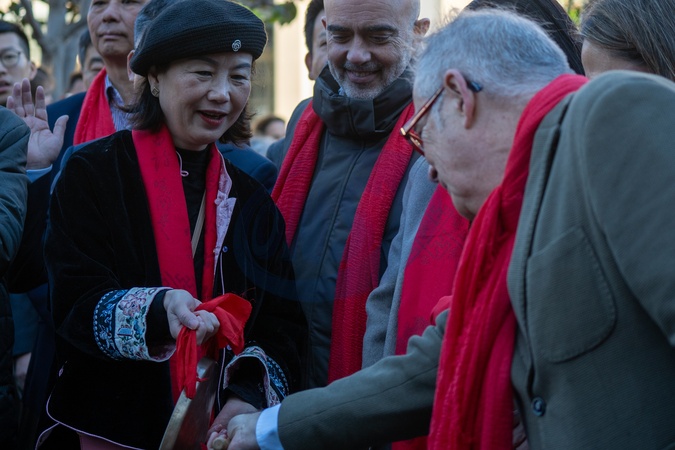 Consul General Meng Yuhong with Jordi Valls performs the ceremonial gong strike to officially open the 2026 Chinese New Year parade in Barcelona, Credit:© 2026 Ivan Sánchez Jiménez / Avalon