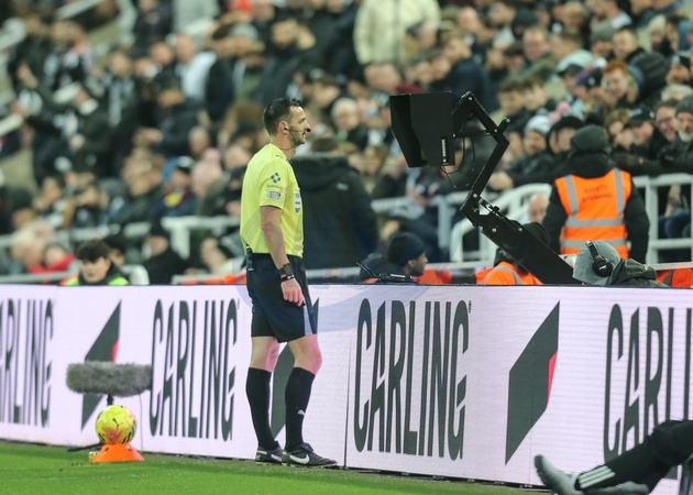 referee Andrew Madley checks the VAR screen during the Premier League match Newcastle Untied vs Brentford at St. James's Park, Newcastle, United Kingdom on 07 February 2026, Credit:Richard Bierton/News Images / Avalon
