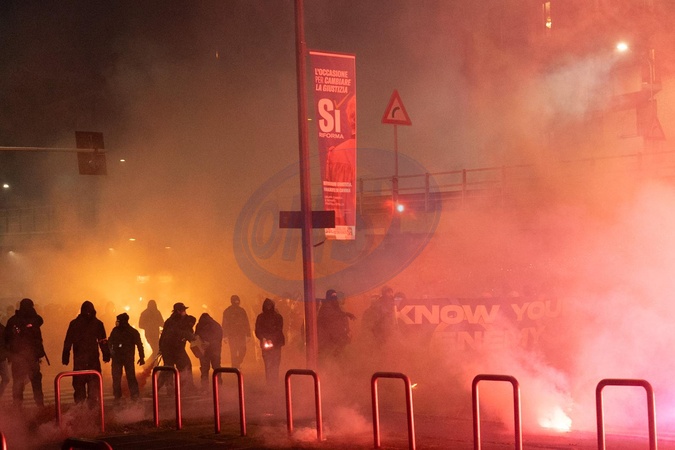 National demonstration "Let's take back our cities, let's free the mountains - Against the most unsustainable Olympic Games ever," organized to protest the first day of competition at the Milan-Cortina Winter Olympics. Clashes between protesters and police are pictured. Milan. Italy 07 Feb 2026, Credit:Selene Daniele/AGF / Avalon