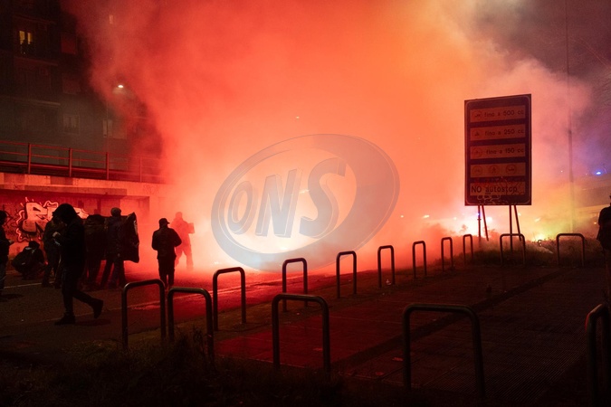 National demonstration "Let's take back our cities, let's free the mountains - Against the most unsustainable Olympic Games ever," organized to protest the first day of competition at the Milan-Cortina Winter Olympics. Clashes between protesters and police are pictured. Milan. Italy 07 Feb 2026, Credit:Selene Daniele/AGF / Avalon