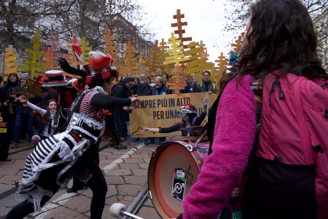 National demonstration "Let's take back our cities, let's free the mountains - Against the most unsustainable Olympic Games ever," organized in protest at the first day of competition at the Milan-Cortina Winter Olympics. In the photo, protesters hold up cardboard trees in homage to the larch forest cut down to build a new bobsleigh track for the games. Milan. Italy 07 Feb 2026, Credit:Selene Daniele/AGF / Avalon