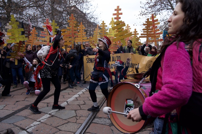 National demonstration "Let's take back our cities, let's free the mountains - Against the most unsustainable Olympic Games ever," organized in protest at the first day of competition at the Milan-Cortina Winter Olympics. In the photo, protesters hold up cardboard trees in homage to the larch forest cut down to build a new bobsleigh track for the games. Milan. Italy 07 Feb 2026, Credit:Selene Daniele/AGF / Avalon