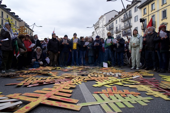 National demonstration "Let's take back our cities, let's free the mountains - Against the most unsustainable Olympic Games ever," organized in protest at the first day of competition at the Milan-Cortina Winter Olympics. In the photo, protesters hold up cardboard trees in homage to the larch forest cut down to build a new bobsleigh track for the games. Milan. Italy 07 Feb 2026, Credit:Selene Daniele/AGF / Avalon