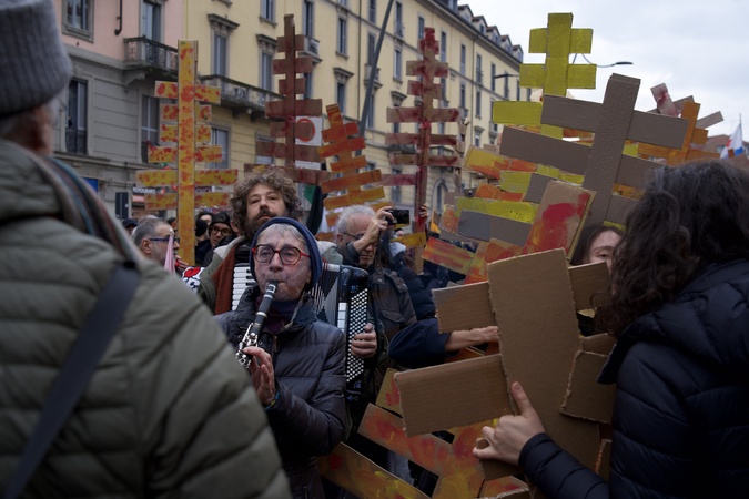 National demonstration "Let's take back our cities, let's free the mountains - Against the most unsustainable Olympic Games ever," organized in protest at the first day of competition at the Milan-Cortina Winter Olympics. In the photo, protesters hold up cardboard trees in homage to the larch forest cut down to build a new bobsleigh track for the games. Milan. Italy 07 Feb 2026, Credit:Selene Daniele/AGF / Avalon