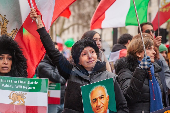 Whitehall, London, UK. 7th February 2026.Members of the Iranian community march through London, arranged by activist group 'Stage of Freedom' in support of 'The Lion and Sun Revolution' - an uprising that started in Iran on Dec 28th 2025, with protests against the Islamic Republic and the return of Pahlavi as their King., Credit:Photo by Amanda Rose / Avalon