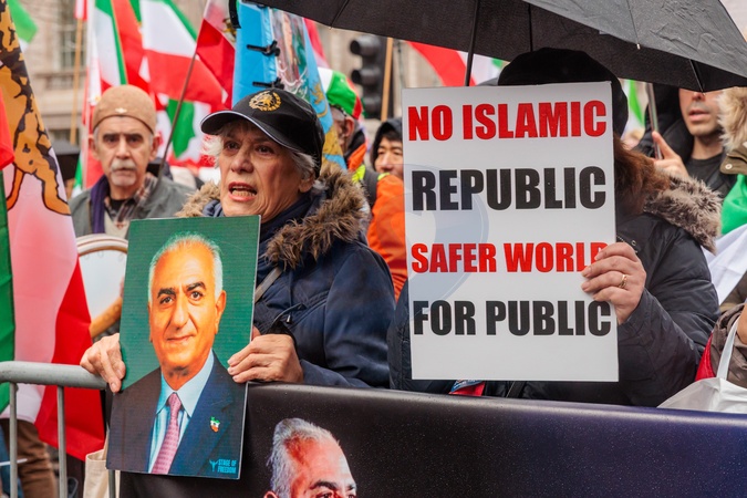 Whitehall, London, UK. 7th February 2026.Members of the Iranian community march through London, arranged by activist group 'Stage of Freedom' in support of 'The Lion and Sun Revolution' - an uprising that started in Iran on Dec 28th 2025, with protests against the Islamic Republic and the return of Pahlavi as their King., Credit:Photo by Amanda Rose / Avalon