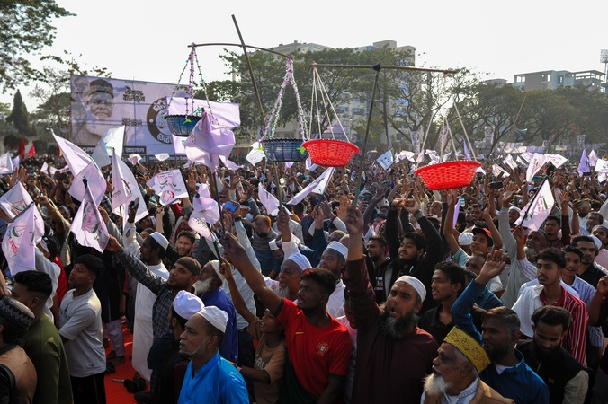Sylhet, Bangladesh- Suppors with Electoral symbol: scales and pestoons,playcards, flags in the pre election rally. Bangladesh Jamaat-e-Islami Ameer DR SHAFIQUR RAHMAN addresses supporters during the 11-party alliance national election campaign rally at the at the historic Sylhet Government Alia Madrasa ground in Sylhet on February 7, and outlining his plans and vision to voters. Thousands of party leaders and supporters from across the Sylhet division attended the rally, including a significant number of women and children., Credit:Md Rafayat Haque Khan / Avalon