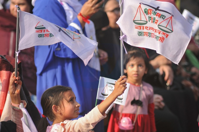 Sylhet, Bangladesh- Suppors with Electoral symbol: scales and pestoons,playcards, flags in the pre election rally. Bangladesh Jamaat-e-Islami Ameer DR SHAFIQUR RAHMAN addresses supporters during the 11-party alliance national election campaign rally at the at the historic Sylhet Government Alia Madrasa ground in Sylhet on February 7, and outlining his plans and vision to voters. Thousands of party leaders and supporters from across the Sylhet division attended the rally, including a significant number of women and children., Credit:Md Rafayat Haque Khan / Avalon