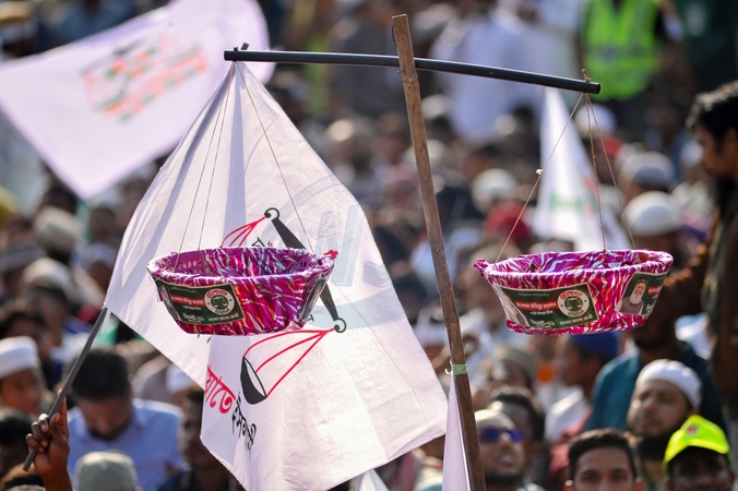 Sylhet, Bangladesh- Suppors with Electoral symbol: scales and pestoons,playcards, flags in the pre election rally. Bangladesh Jamaat-e-Islami Ameer DR SHAFIQUR RAHMAN addresses supporters during the 11-party alliance national election campaign rally at the at the historic Sylhet Government Alia Madrasa ground in Sylhet on February 7, and outlining his plans and vision to voters. Thousands of party leaders and supporters from across the Sylhet division attended the rally, including a significant number of women and children., Credit:Md Rafayat Haque Khan / Avalon