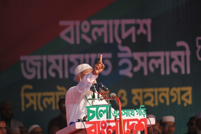 Sylhet, Bangladesh- Bangladesh Jamaat-e-Islami Ameer DR SHAFIQUR RAHMAN addresses supporters during the 11-party alliance national election campaign rally at the at the historic Sylhet Government Alia Madrasa ground in Sylhet on February 7, and outlining his plans and vision to voters. Thousands of party leaders and supporters from across the Sylhet division attended the rally, including a significant number of women and children., Credit:Md Rafayat Haque Khan / Avalon