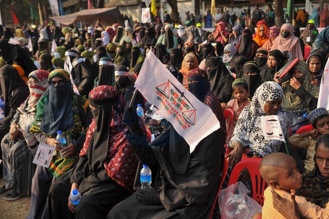 Sylhet, Bangladesh- Suppors with Electoral symbol: scales and pestoons,playcards, flags in the pre election rally. Bangladesh Jamaat-e-Islami Ameer DR SHAFIQUR RAHMAN addresses supporters during the 11-party alliance national election campaign rally at the at the historic Sylhet Government Alia Madrasa ground in Sylhet on February 7, and outlining his plans and vision to voters. Thousands of party leaders and supporters from across the Sylhet division attended the rally, including a significant number of women and children., Credit:Md Rafayat Haque Khan / Avalon