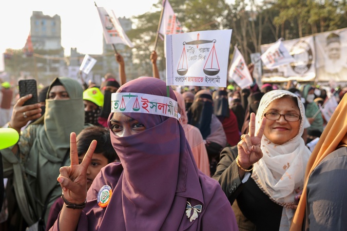 Sylhet, Bangladesh- Suppors with Electoral symbol: scales and pestoons,playcards, flags in the pre election rally. Bangladesh Jamaat-e-Islami Ameer DR SHAFIQUR RAHMAN addresses supporters during the 11-party alliance national election campaign rally at the at the historic Sylhet Government Alia Madrasa ground in Sylhet on February 7, and outlining his plans and vision to voters. Thousands of party leaders and supporters from across the Sylhet division attended the rally, including a significant number of women and children., Credit:Md Rafayat Haque Khan / Avalon