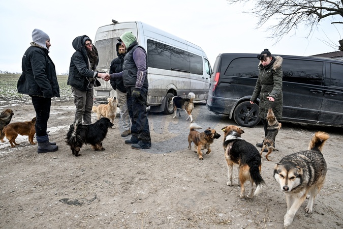 Owner of the Pehas shelter Olena Rusyna (L) welcomes volunteers who have evacuated nine goats from the front-line town of Orikhiv in southeastern Zaporizhzhia region, Dnipropetrovsk region, Ukraine, February 6, 2026. This, Credit:Dmytro Smolienko / Avalon
