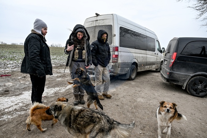 Owner of the Pehas shelter Olena Rusyna (L) welcomes volunteers who have evacuated nine goats from the front-line town of Orikhiv in southeastern Zaporizhzhia region, Dnipropetrovsk region, Ukraine, February 6, 2026. This, Credit:Dmytro Smolienko / Avalon
