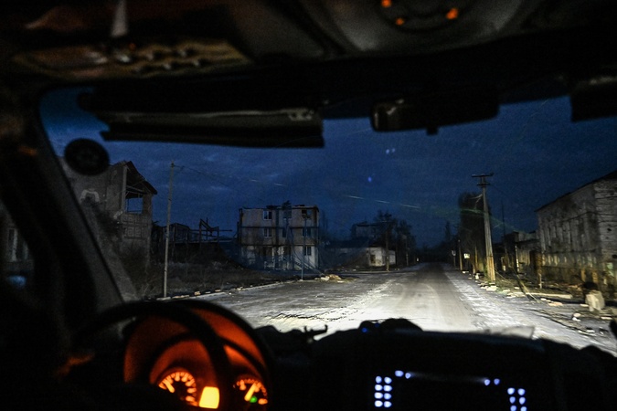A van drives along a street past destroyed buildings in Orikhiv at dawn, Zaporizhzhia region, Ukraine, February 6, 2026. Volunteers are set to evacuate nine goats from the front-line town of Orikhiv in the southeastern Zaporizhzhia region to the Pehas animal shelter in the Dnipropetrovsk region., Credit:Dmytro Smolienko / Avalon