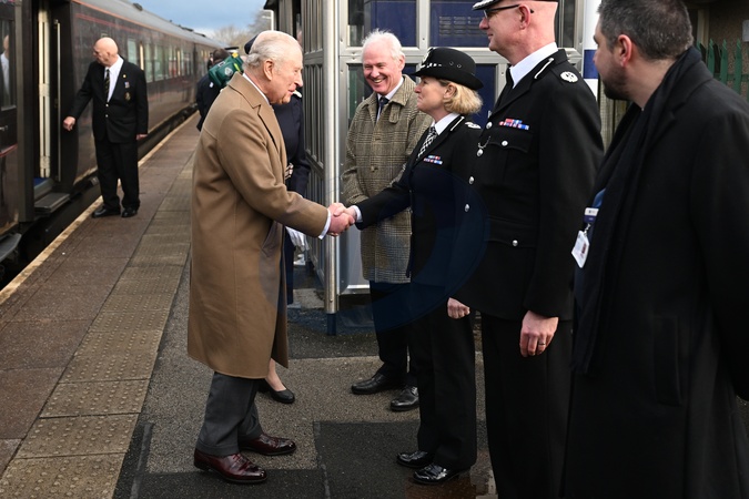 Britain's King Charles III shakes hands with Chief Constable of Lancashire, Sacha Hatchett on the platform at Clitheroe Station during a visit to the town of Clitheroe, northern England on February 9, 2026., Credit:PAUL ELLIS / Avalon
