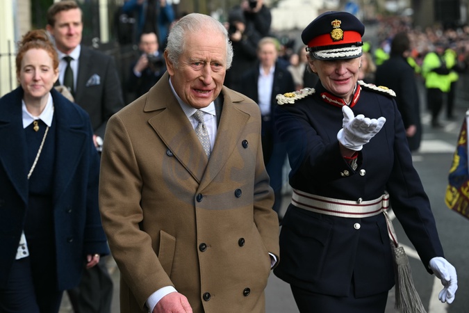 Britain's King Charles III (C) and The Lord-Lieutenant of Lancashire, Amanda Parker (R) leave Clitheroe Station to meet well-wishers during a visit to the town of Clitheroe in northern England on February 9, 2026., Credit:PAUL ELLIS / Avalon