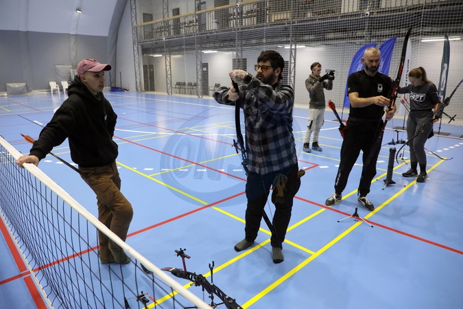 Members of the national veteran team practise archery during the training camp in preparation for the 2026 Marine Corps & Air Force Trials (MC&AF Trials), to be held February 20–March 3, 2026, at Camp Pendleton, California, Kyiv, February 6, 2026. The team's preparation, training, and participation are organised by the Ministry of Veterans Affairs of Ukraine together with the CBA Initiatives Center, within the framework of the Veteran Policy Strategy and the National Strategy for Creating a Barrier-Free Space in Ukraine, developed at the initiative of First Lady Olena Zelenska., Credit:Yuliia Ovsiannikova / Avalon