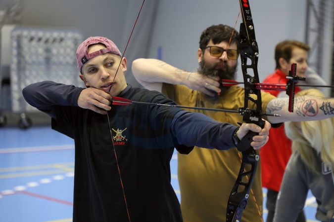 Members of the national veteran team practise archery during the training camp in preparation for the 2026 Marine Corps & Air Force Trials (MC&AF Trials), to be held February 20–March 3, 2026, at Camp Pendleton, California, Kyiv, February 6, 2026. The team's preparation, training, and participation are organised by the Ministry of Veterans Affairs of Ukraine together with the CBA Initiatives Center, within the framework of the Veteran Policy Strategy and the National Strategy for Creating a Barrier-Free Space in Ukraine, developed at the initiative of First Lady Olena Zelenska., Credit:Yuliia Ovsiannikova / Avalon
