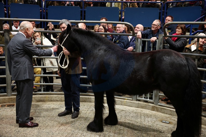 Britain's King Charles meets Pearl, a Fell pony, at Clitheroe Auction Mart, during his visit to Lancashire, in Clitheroe, Britain, February 9, 2026., Credit:Phil Noble / Avalon