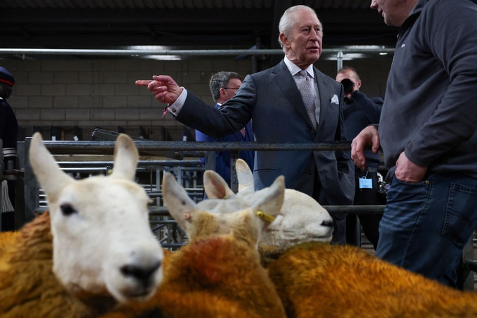 Britain's King Charles speaks with a farmer next to sheep at Clitheroe Auction Mart, during his visit to Lancashire, in Clitheroe, Britain, February 9, 2026., Credit:Phil Noble / Avalon