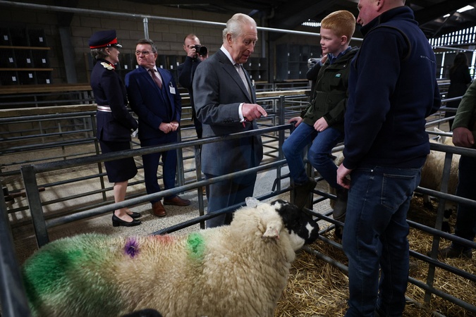 Britain's King Charles speaks with Stanley Kempson, 8, at Clitheroe Auction Mart, during his visit to Lancashire, in Clitheroe, Britain, February 9, 2026., Credit:Phil Noble / Avalon