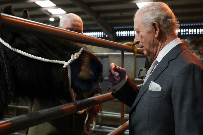 Britain's King Charles strokes a Fell pony at Clitheroe Auction Mart, during his visit to Lancashire, in Clitheroe, Britain, February 9, 2026., Credit:Phil Noble / Avalon
