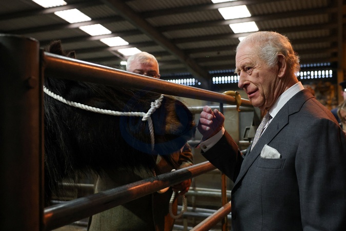 Britain's King Charles strokes a Fell pony at Clitheroe Auction Mart, during his visit to Lancashire, in Clitheroe, Britain, February 9, 2026., Credit:Phil Noble / Avalon