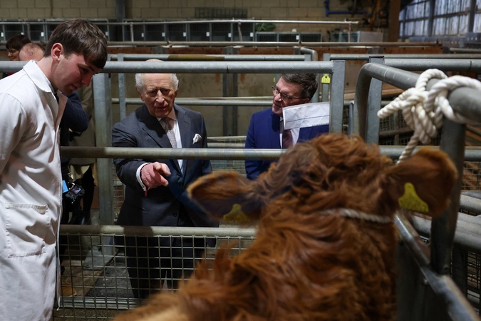 Britain's King Charles points towards a bovine animal at Clitheroe Auction Mart, during his visit to Lancashire, in Clitheroe, Britain, February 9, 2026., Credit:Phil Noble / Avalon