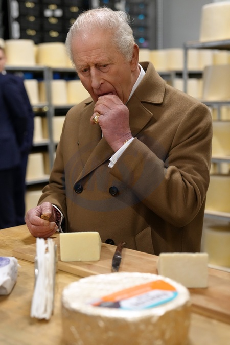 Britain's King Charles III tastes cheese as he visits the newly opened Butlers' cheese campus, a fourth-generation family cheesemaker, established in 1932, that combines traditional skills, innovation, and a passion for farmhouse cheesemaking in Preston, England, Monday, Feb. 9, 2026.(AP Photo/Jon Super, Pool), Credit:Jon Super / Avalon