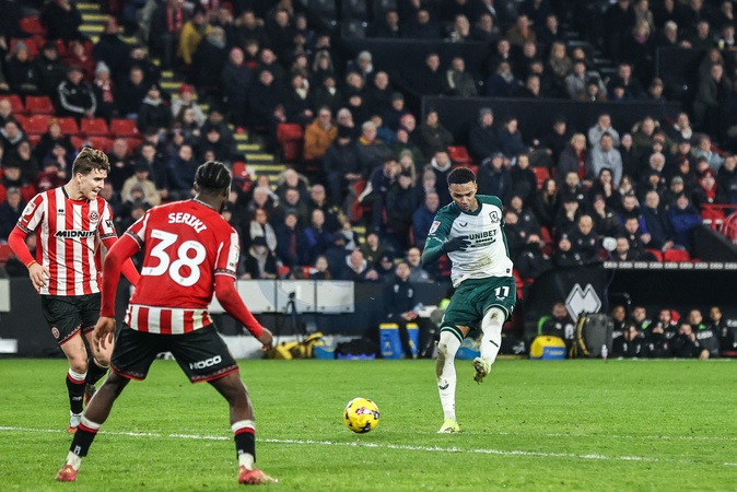 Morgan Whittaker of Middlesbrough shoots on goal during the Sky Bet Championship match Sheffield United vs Middlesbrough at Bramall Lane, Sheffield, United Kingdom on 09 February 2026, Credit:Ae Cosgrove/News Images / Avalon
