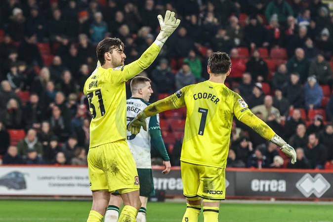 Sheffield United goalkeeper Michael Cooper holds off Middlesbrough goalkeeper Sol Brynn as Sheffield United are looking for a late goal to level the score during the Sky Bet Championship match Sheffield United vs Middlesbrough at Bramall Lane, Sheffield, United Kingdom on 09 February 2026, Credit:Ae Cosgrove/News Images / Avalon