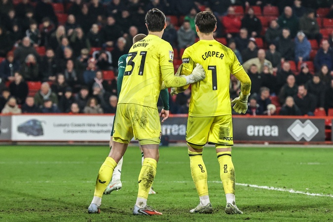 Sheffield United goalkeeper Michael Cooper holds off Middlesbrough goalkeeper Sol Brynn as Sheffield United are looking for a late goal to level the score during the Sky Bet Championship match Sheffield United vs Middlesbrough at Bramall Lane, Sheffield, United Kingdom on 09 February 2026, Credit:Ae Cosgrove/News Images / Avalon
