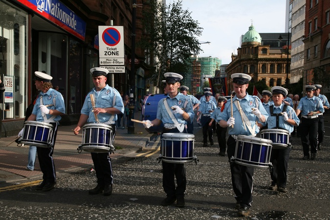Coroczna parada w Belfascie pt. Orange March - Marsz Oranzystow. Czlonkowie Towarzystwa Oranskiego tzw. oranzysci. Do organizacji tej naleza angielscy protestanci, ktorzy opowiadaja sie za utrzymaniem zwiazkow z Anglia. Belfast Irlandia Polnocna / The ann