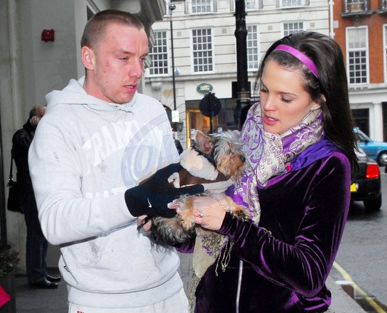 Danielle Lloyd i jej narzeczony Jamie O'Hara na spacerze z psem, Londyn