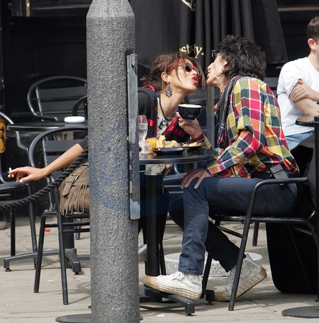 Ronnie Wood ze swoja dziewczyna w ogrodku kawiarnianym, Londyn