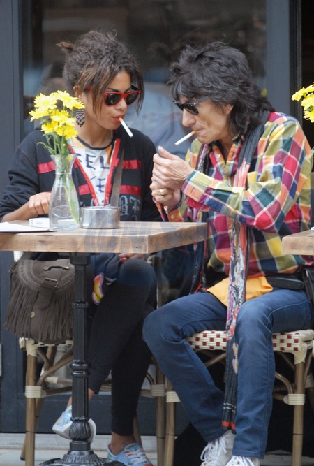 Ronnie Wood ze swoja dziewczyna w ogrodku kawiarnianym, Londyn