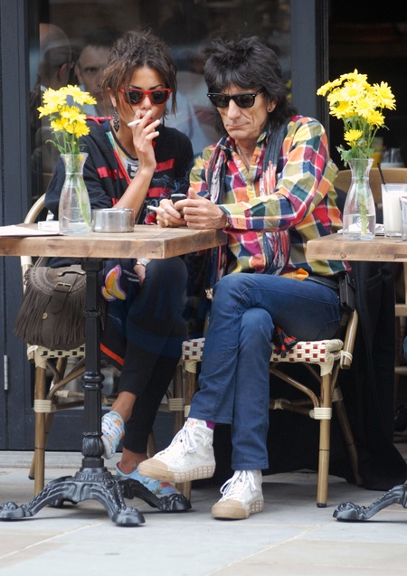 Ronnie Wood ze swoja dziewczyna w ogrodku kawiarnianym, Londyn