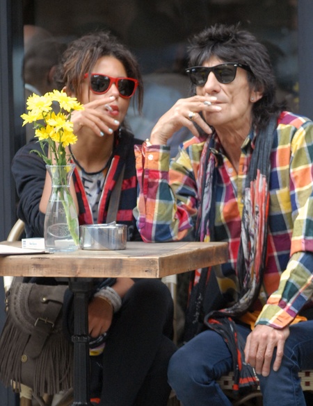 Ronnie Wood ze swoja dziewczyna w ogrodku kawiarnianym, Londyn