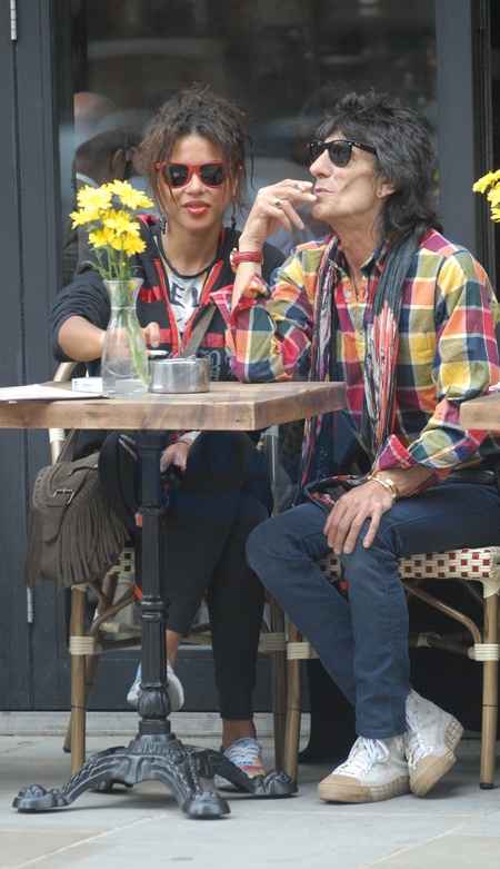 Ronnie Wood ze swoja dziewczyna w ogrodku kawiarnianym, Londyn