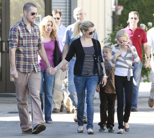 Reese Witherspoon z dziecmi i chlopakiem ida do kosciola, Los Angeles