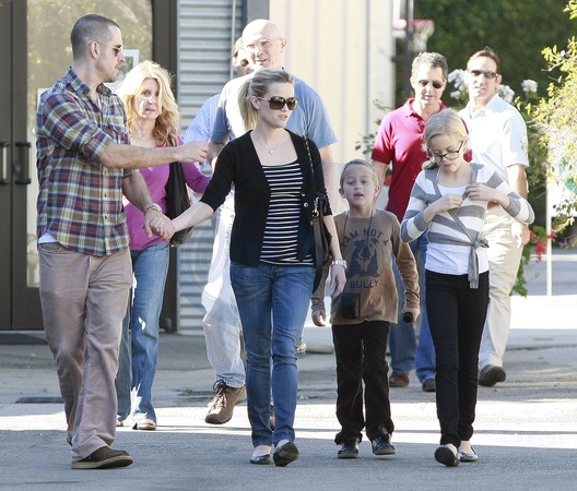 Reese Witherspoon z dziecmi i chlopakiem ida do kosciola, Los Angeles