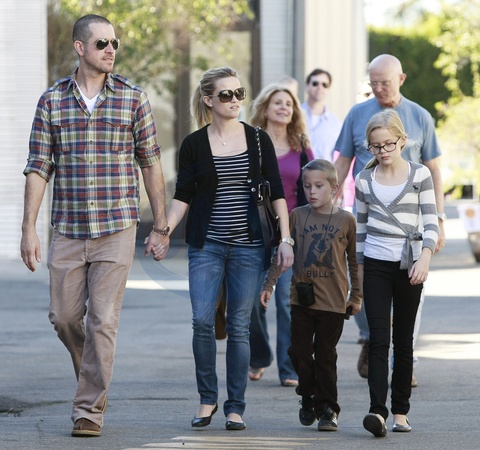 Reese Witherspoon z dziecmi i chlopakiem ida do kosciola, Los Angeles