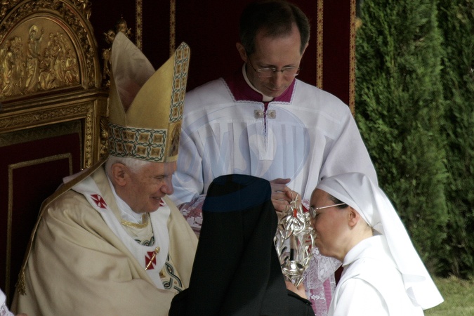 Uzdrowiona przez Jana Pawla II Marie Simon-Pierre i siostra Tobiana, niosa relikwiarz z ampulka jego krwi