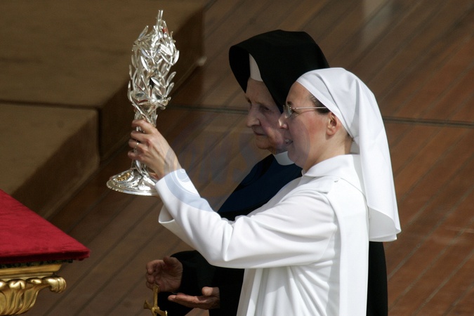 Uzdrowiona przez Jana Pawla II Marie Simon-Pierre i siostra Tobiana, niosa relikwiarz z ampulka jego krwi