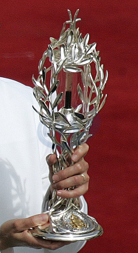 Uzdrowiona przez Jana Pawla II Marie Simon-Pierre i siostra Tobiana, niosa relikwiarz z ampulka jego krwi