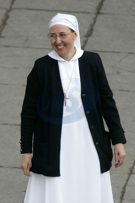 Uzdrowiona przez Jana Pawla II Marie Simon-Pierre i siostra Tobiana, niosa relikwiarz z ampulka jego krwi