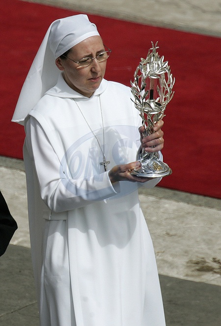 Uzdrowiona przez Jana Pawla II Marie Simon-Pierre i siostra Tobiana, niosa relikwiarz z ampulka jego krwi