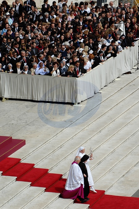 Uzdrowiona przez Jana Pawla II Marie Simon-Pierre i siostra Tobiana, niosa relikwiarz z ampulka jego krwi
